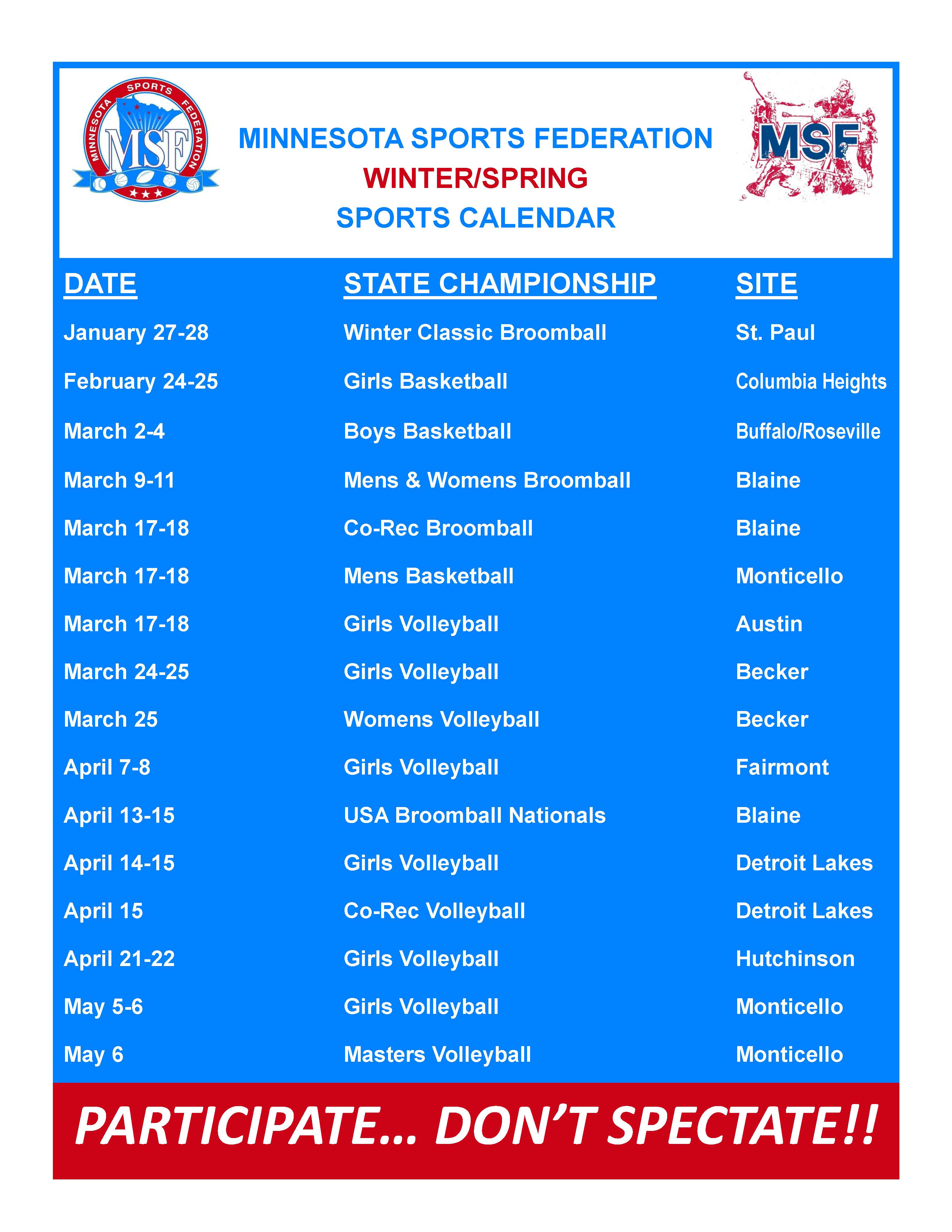A quick glance at the 2018 MSF Winter/Spring State Championship Schedule shows many opportunities to get off the couch and into your favorite activity this winter and spring. Great camaraderie, competition, and exercise for those who participate, not spectate!
