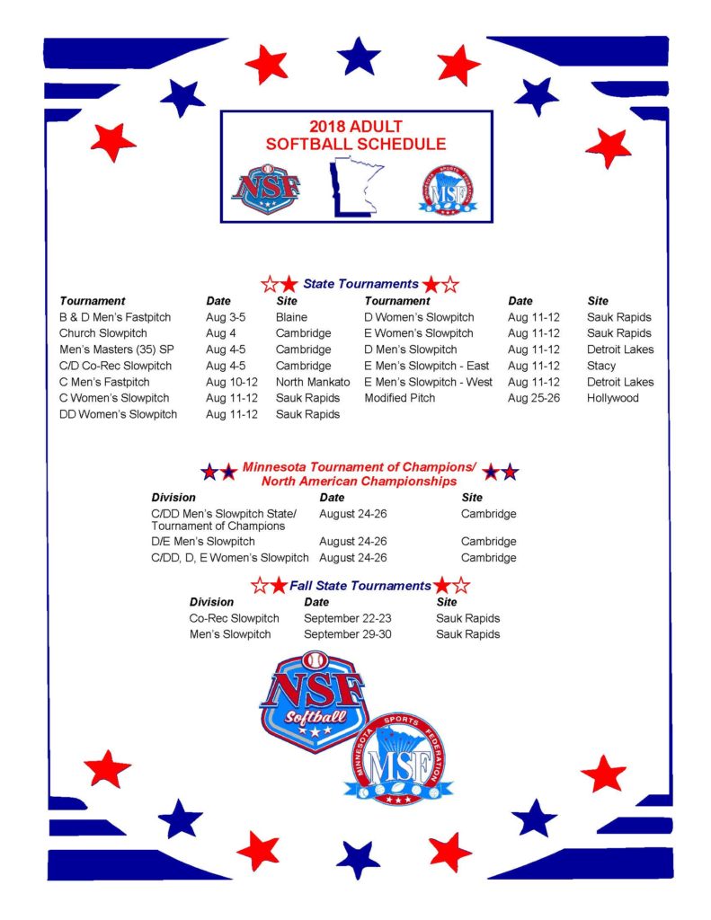 Softball Managers and Players: In spite of the colder winter temperatures, it’s never too early to begin planning to participate in 2018 NSF-MSF State Tournament play and the 2018 NSF North American National Championships in Cambridge, Minnesota on August 24 – 26. Visit the MSF website at www.msf1.org after June 15 to enter or inform your league director you want to play. The NSF–MSF program continues to provide the most bang for your buck with three or more games guaranteed at the lowest entry fee available. Quality umpiring, field maintenance and first class awards are also staples of NSF- MSF post season tournament play. Join the action again in 2018!!
