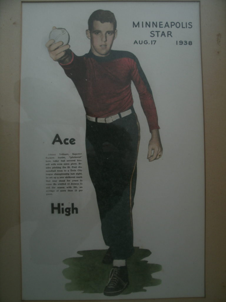 In 1936 Vollmer graduated from Mechanic Arts high school in Saint Paul. Fast pitch softball was gaining a lot of popularity out east in 1936, and one team in Cleveland, Ohio wanted Vollmer to be their pitcher. The team was sponsored by the Ace Box Lunch Company and they paid for Vollmer’s train ride and all his accommodation to bring him to Cleveland. I guess they wanted to get a closer look at this softball marvel, so they arranged for him to pitch a game against their own team. When all was said and done Vollmer had struck out 20 of the 21 batters he had faced, a spectacular performance of speed and control. What was interesting about that performance Johnny gave is that Bob Feller, the sensational Cleveland Indians baseball pitcher was there to watch the 20-strikeout exhibition.